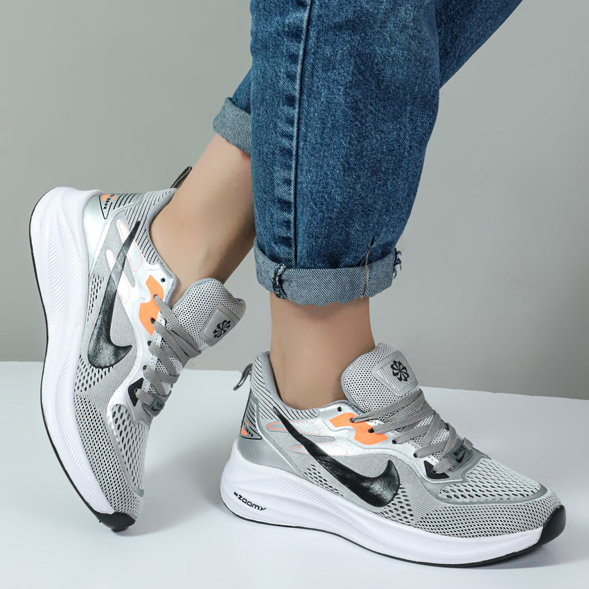 کتونی اسپرت نایک زوم زنانه zoom ورزشی رویه بافت رنگ طوسی نارنجی کد 013879